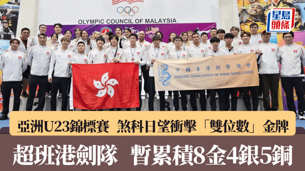 香港劍擊隊在大馬吉隆坡舉行的亞洲23歲以下劍擊錦標賽,延續日日有金牌落袋的威勢,周六完成第4日的比賽,共擸走8金4銀5銅,包括下月將代表香港出戰全運會的薛雅齊,她一人包辦個人賽及團體賽2金,包括周六連同隊友梁洛文、劉綺程及曾悅澄取奪女重團體賽金牌;周日煞科還有3項團體賽,有望衝擊「雙位數」金牌。