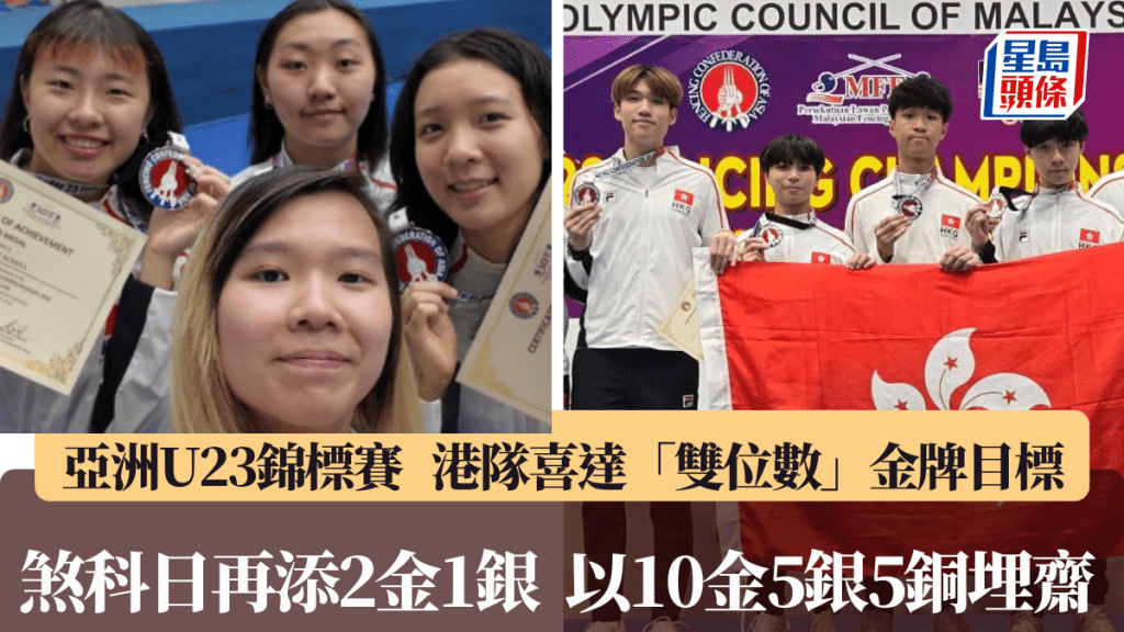 香港劍擊隊周日在吉隆坡的亞洲U23劍擊錦標賽煞科日,再添2金1銀團體,如願達成「雙位數」金牌,功臣包括來自男花、男佩及女重團體賽的成員,總結5天的比賽,港隊共豪奪10金5銀5銅共20面獎牌。