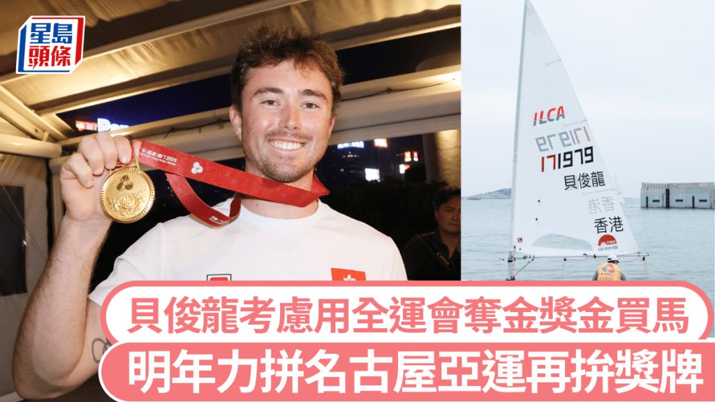 為香港奪得粵港澳全運會競賽項目「第一金」的帆船代表貝俊龍(Nicholas),周四隨隊回到香港出席慶功活動,心情大好的他坦言職業生涯第一次奪得75萬港元金牌獎金,他笑說有機會將全筆獎金拿去買馬,他說:「你們或會在下周三在馬場見到我,我也許會將全部獎金買馬。」下一步,貝俊龍期望明年名古屋亞運會爭取獎牌,以彌補上屆杭州亞運「梗頸四」的遺憾。