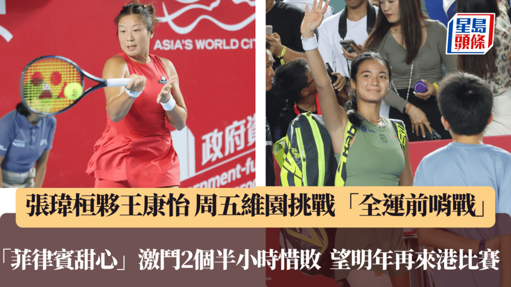 香港女網一姐張瑋桓(Eudice)周四在維園的保誠香港網球公開賽女單16強,力戰下以2:6、1:6不敵日本外圍賽球手坂詰姬野,期望周五跟王康怡(Cody)的雙打8強兼「全運前哨戰」能帶給球迷驚喜;同日,「菲律賓甜心」伊娜(Alexandra Eala)以6:3、3:6、4:6反負給比自己還要少一歲、年僅19歲 的加拿大新星Victoria Mboko,她賽後表示,希望明年再來香港比賽。