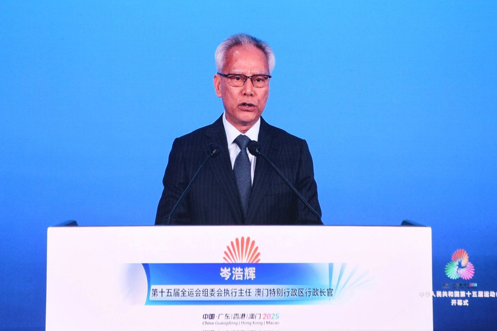 20:38 澳門行政長官岑浩輝致辭時亦有衷心感謝中央政府的信任與支持,並向國家體育總局、廣東省及香港特別行政區 政府以及所有為本屆全運會付出辛勤努力的運動健兒、工作人員和志願者致最誠摯的感謝與崇高的敬意。他衷心祝願第十五屆全運會圓滿成功,並祝福所有運動員再創佳績。