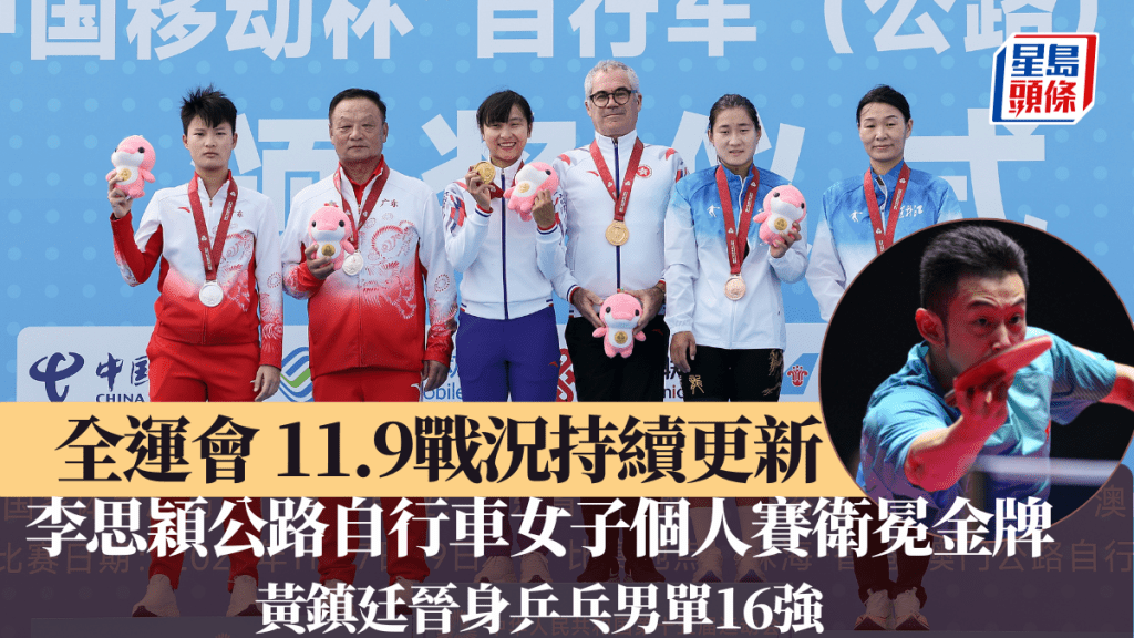 第15屆全運會今晚8時將於廣州廣東奧林匹克體育中心舉行開幕典禮,而今天(周日)港隊繼續分途出擊,在早上的公路自行車女子個人賽,李思穎就已經成功衛冕,為香港奪得今屆全運會第二金。港隊乒乓球一哥黃鎮廷,就於男單驚險過關晉級16強。至於香港賽區方面今天沒有比賽。