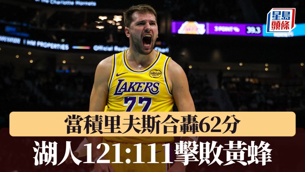 湖人上戰作客大敗鷹隊親手中斷五連勝,周一作客黃蜂狀態明顯回暖,當積(Luka Doncic)轟入全場最高的38分,復出的里夫斯(Austin Reaves)亦轟入24分,黃蜂雖有布里吉斯(Miles Bridges)攻入34分,但亦無力阻止湖人以121:111擊敗黃蜂。