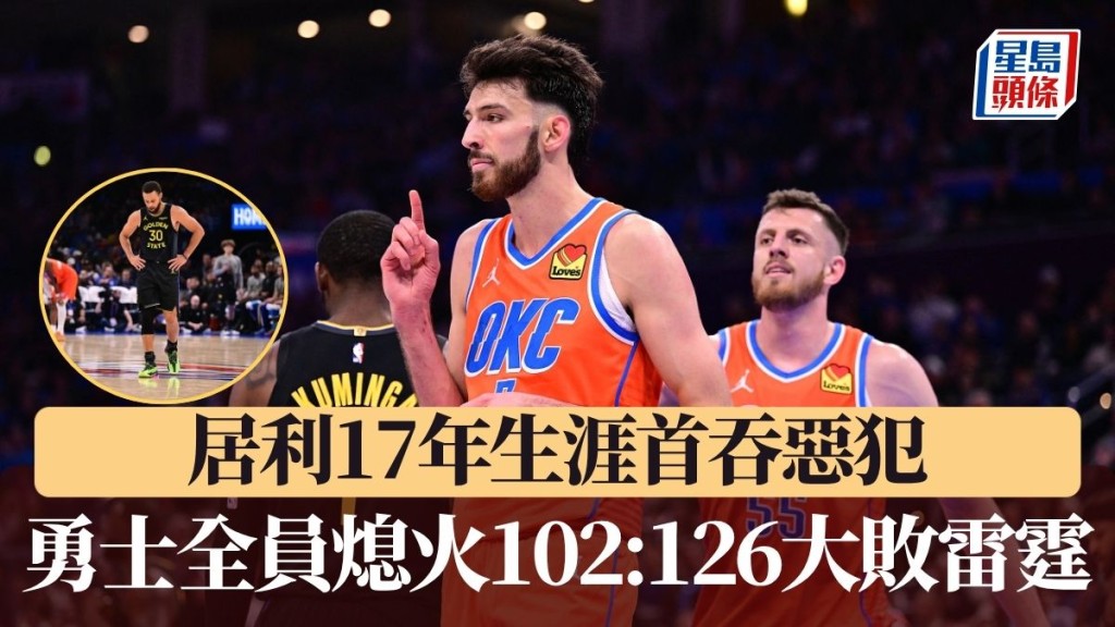 周二勇士作客對上衛冕冠軍雷霆,今場是球隊一哥居利(Stephen Curry)休息三場後歸隊但全隊表現不佳,全隊得分最高已經是古明加(Johnathan Kuminga)的13分,居里更在一次防守中吞生涯首次惡意犯規,雷霆有亞歷山大(Shai Gilgeous-Alexander, SGA)打入全場最高的28分助雷霆126:102大炒勇士。