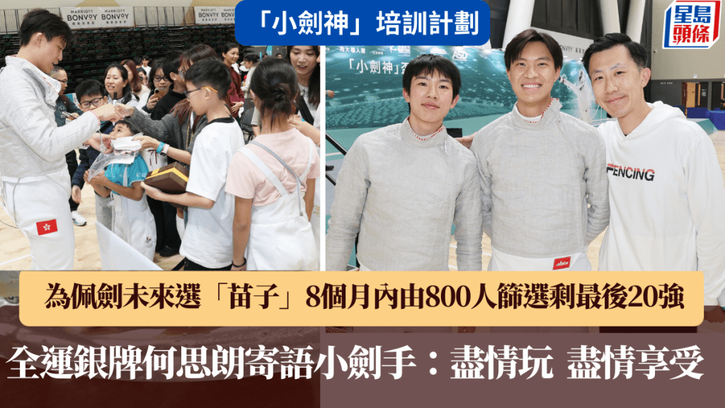 周大福人壽冠名贊助的飛越啟德「小劍神」培訓計劃,周六在啟德體藝館的習藝坊舉行「小劍神」決賽暨畢業禮,共有20名年齡介乎9歲至14歲的小劍手躋身為期一年半的精英培訓計劃,去年11月在體藝館奪得粵港澳全運會男子佩劍個人賽銀牌的何思朗,寄語小劍手們:「在打劍方面,盡情玩、盡情享受,不要給自己在壓力下打劍,要在開心愉快的心情下打劍,成績自然而來。」