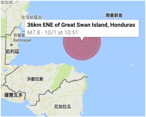 而香港天文台就指,今早10時52分探測到洪都拉斯北面,特古西加爾巴之東北約550公里,發生黎特制7.8級地震。美國地質調查局發出海嘯警報,危險範圍包括震央1000公里以內的沿海地區,包括牙買加、墨西哥、洪都拉斯、古巴、哥斯達黎加等。