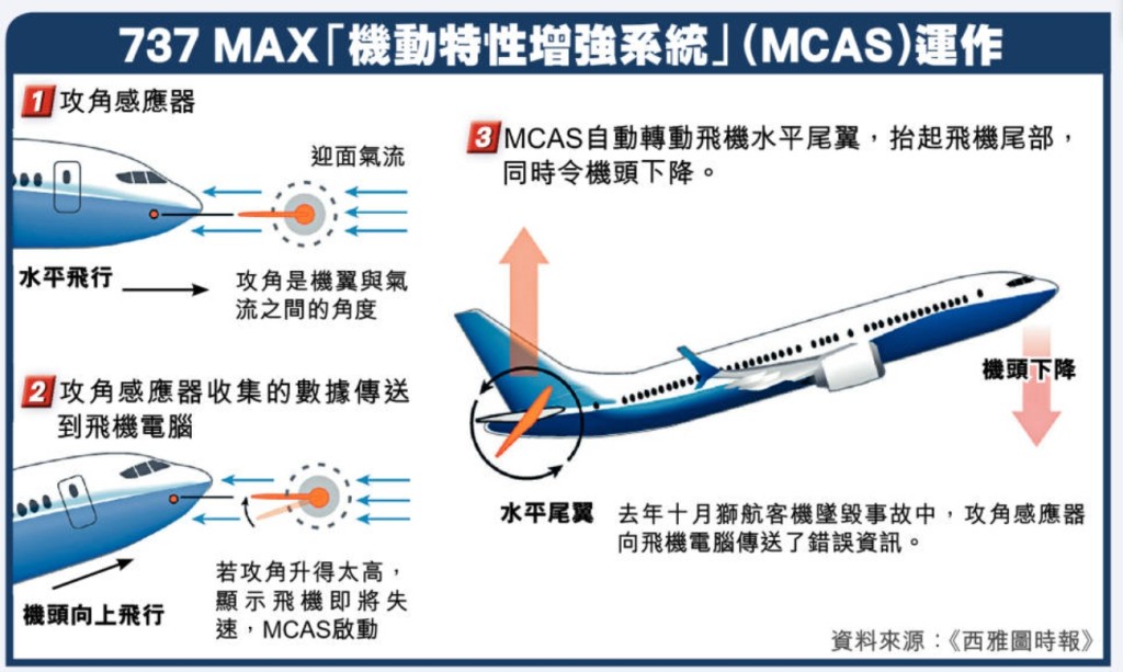 第三,MCAS本身存在設計缺陷。報告沒說明機師每次做出反應後,系統可能自動重設的情況,因而讓MCAS不斷壓低機頭的潛在嚴重性遭忽略。MCAS反覆多次被啟動後,飛機就可能達到俯衝狀態。