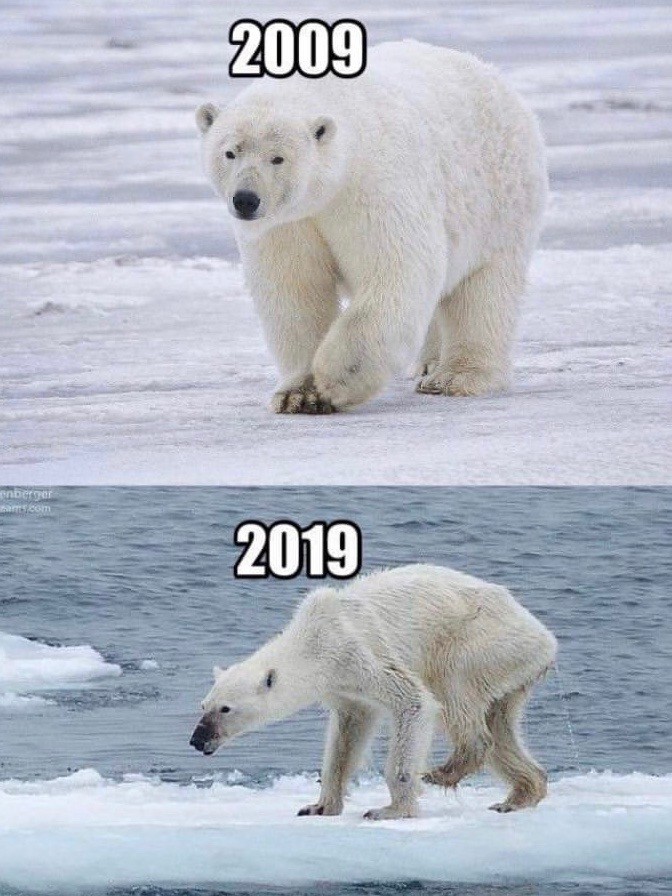 也有網民用北極熊的照片製作北極熊比對,圖片中可以看到現在的北極熊瘦到皮包骨,與2009年的北極熊的圖片成為強烈對比。全球暖化加劇,海冰的結冰期太短,導致北極熊無法離岸到海裏捕捉海豹來食用,被迫待在陸地上覓食最後被餓死。