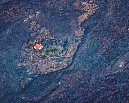 (星島日報報道)位於西班牙加那利群島西北部的火山島拉帕爾馬島上的老昆布雷火山本周日首次爆發,隨後多處遭岩漿波及,並引發山火,迄今已摧毀附近約三百五十間房屋、逾六千人要疏散。不過,有人發現竟然有一間房屋未被波及,在巨災中屹立不倒。社交媒體上有網民將這棟小屋稱為「奇迹之屋」,圖片顯示這間未受損的房屋和附近被燒焦的黑色景觀形成強烈對比。