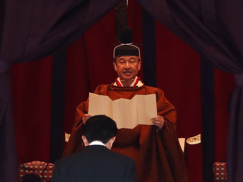 德仁在「高御座」上發表即位致詞,當中提到會繼承上皇明仁讓國民幸福及世界和平的主張,與人民保持親近,並希望透過民間智慧和努力,將日本發展成國際間的友好和平國家,為人類的福祉與繁榮作出貢獻。