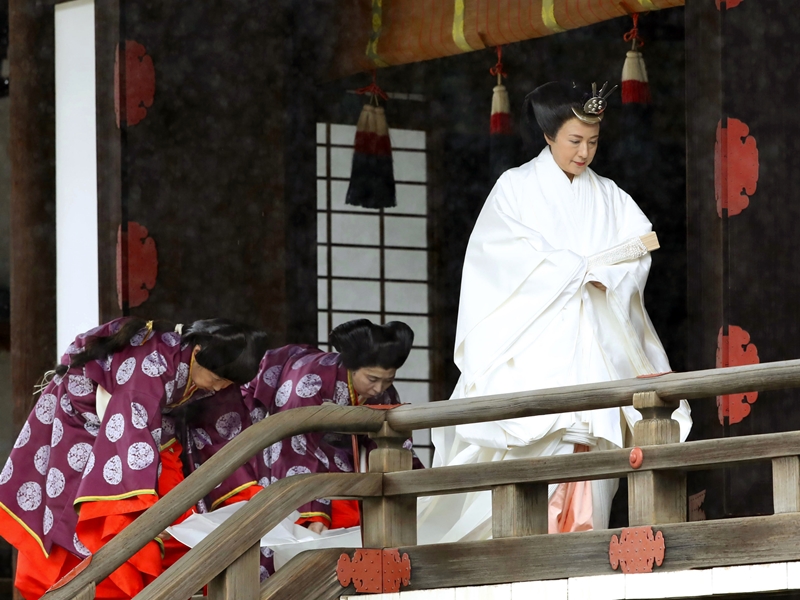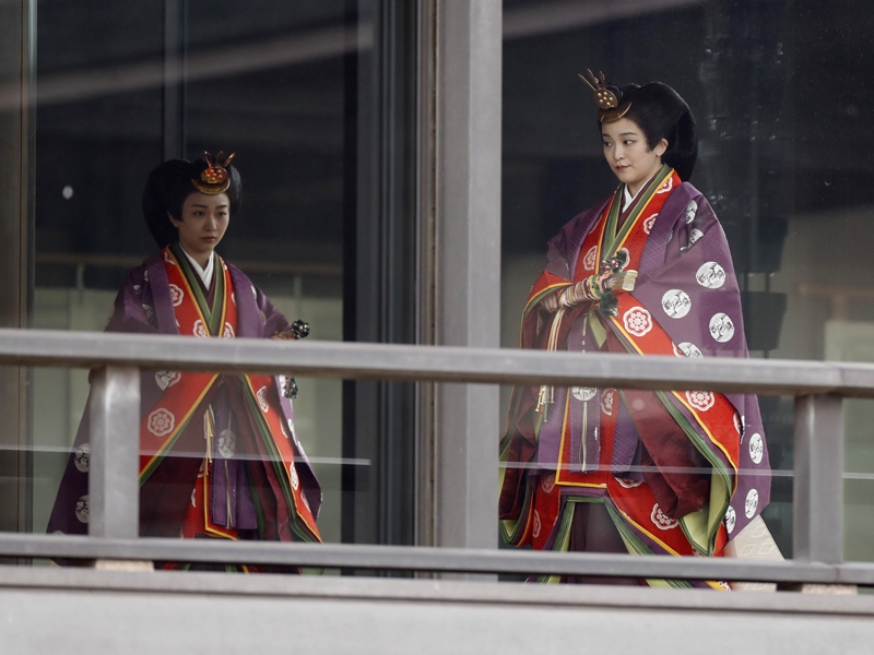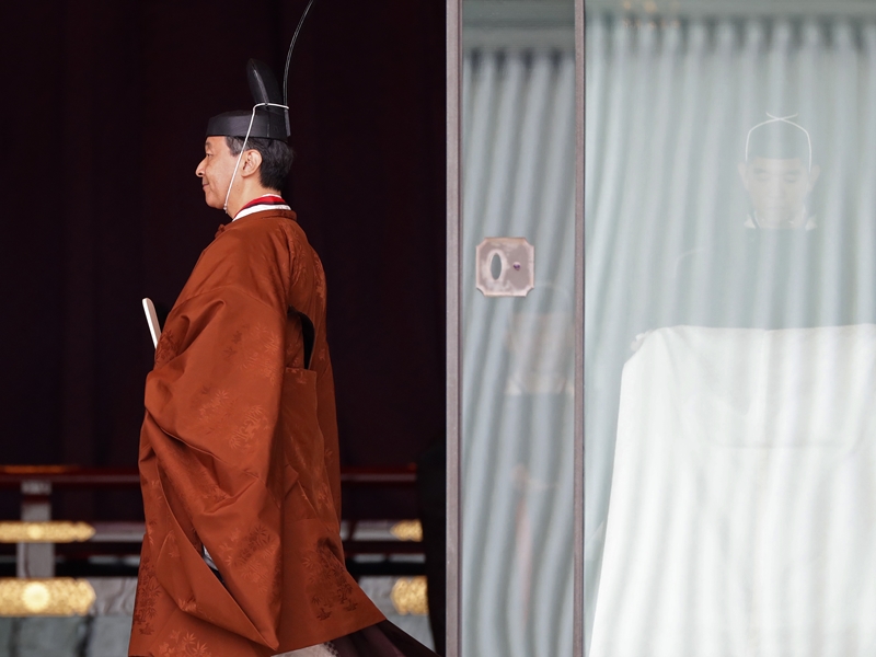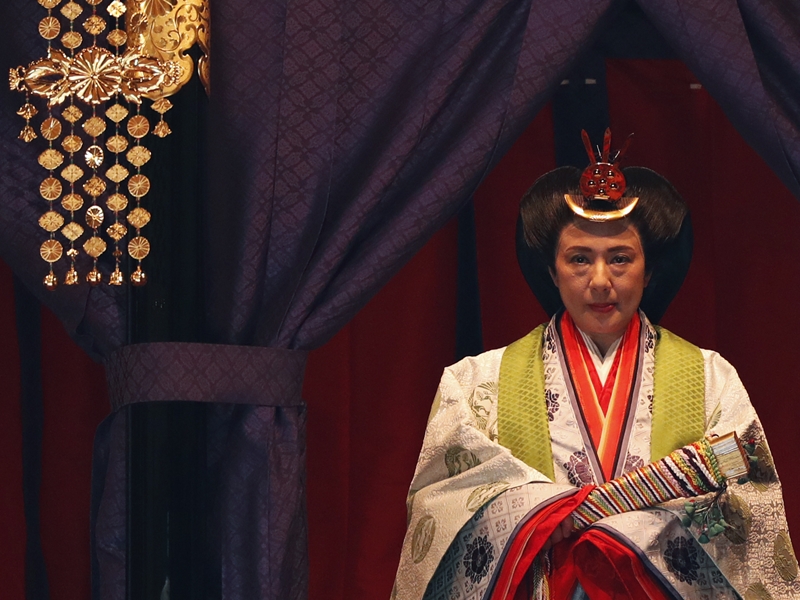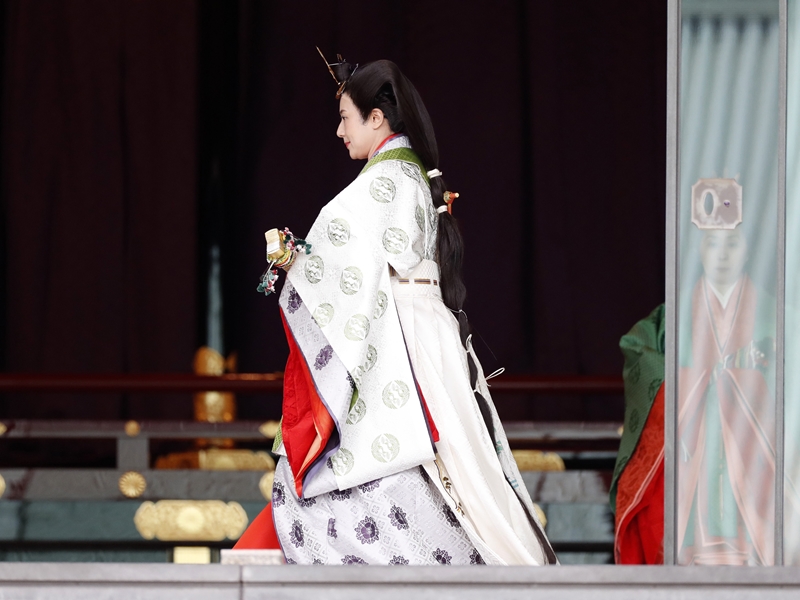 德仁身穿「黃櫨染御袍」從「高御座」中現身,一旁的「御帳台」則是皇后雅子,同樣穿上由白、綠、淺紫色及紅色等各色交疊的傳統衣裝「十二單」。