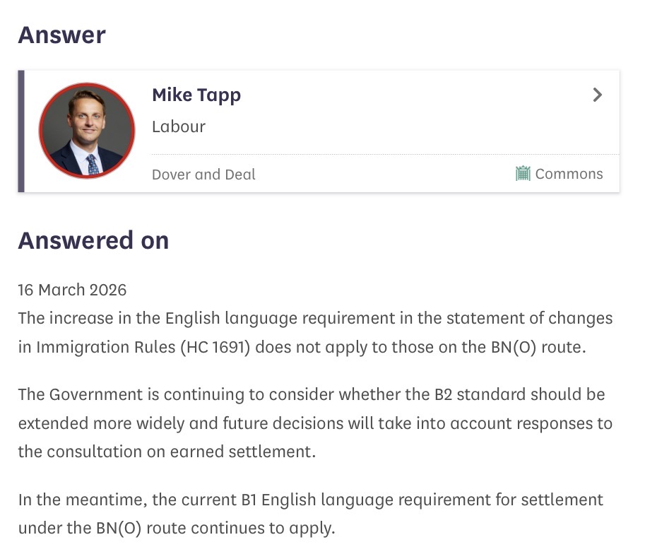 英國內政部移民及公民事務大臣塔普(Mike Tapp)最新書面回覆,表明B2英語要求不適用於BNO移英人士。
