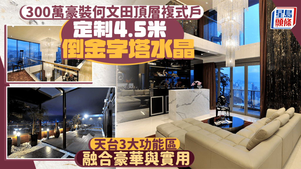 相关文章:300萬豪裝何文田頂層複式戶 定制4.5米倒金字塔水晶燈 天台3大功能區融合豪華與實用
