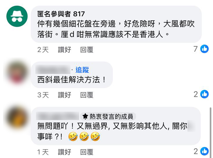 對於該單位的綠化景象,網上評論呈現兩極化。部分人認為無傷大雅,甚至大讚「這是解決西斜問題的最佳方法」、「既美觀又環保,個花槽本身不就是這樣用的嗎?」亦有人質疑發帖人過於敏感,認為植物並未過界干擾他人,直言「阻到你咩?真係多事」。