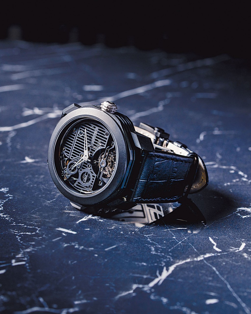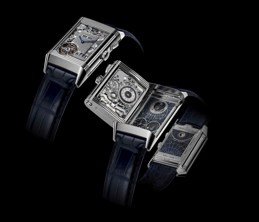 Reverso Hybris Mechanica Calibre 185是今年積家為慶祝Reverso系列推出的限量頂級複雜功能腕表,此腕表可說是反轉再反轉,因為不止於兩面、三面而是四面!這枚又名Reverso Quardriptyque的四面表用盡表殼兩面,還有表框底部的兩面。集十一項功能於一身,正面是萬年曆及陀飛輪,那三問報時呢?原來是設在第二面。這面設有偏心式時分盤,以跳時及外圍式分時設計,所顯示的第二時間與正面表面對應。表面底部可見到拋石器形的特強音鎚,報時裝置採用品牌自創全新設計,直接將報時水晶音簧固定在藍寶石水晶玻璃上。創新的方形切面音簧,可增加音錘和音簧接觸面及能量傳輸,配合鉸接式Trébuchet天秤錘,能清脆利落而有力地敲擊音簧。這些創新設計令此表能發出當今腕表中最為清脆響亮的報時聲。只要滑動表冠下方的槓桿,便會奏出美妙的報時旋律。附送精美表盒設有調校器,讓佩戴者在長時間閒置腕表後,仍能迅速並直接設定腕表所有日曆和天文顯示。