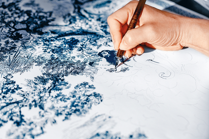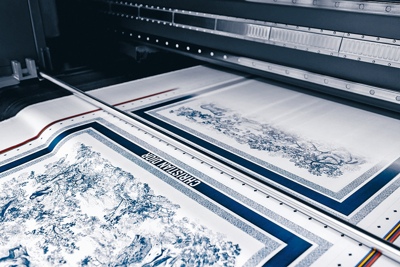絲巾的圖案固然是靈魂所在,吸引目光注視的首要條件。然而在探索一條絲巾背後細膩的製作過程後,將之視為藝術作品絕不為過,其珍貴指數亦倍增。首先將圖案印在真絲布料上,工匠會在模版上以水彩顏料為原圖 色,之後將完成圖案複印於絲巾上。品牌工坊會使用專門的機器製作,使之呈現出複雜的圖案。其中花版印刷方法能準確還原圖案的生動色彩,而噴墨印刷法則可以印製出兩面相同或不同的色彩。