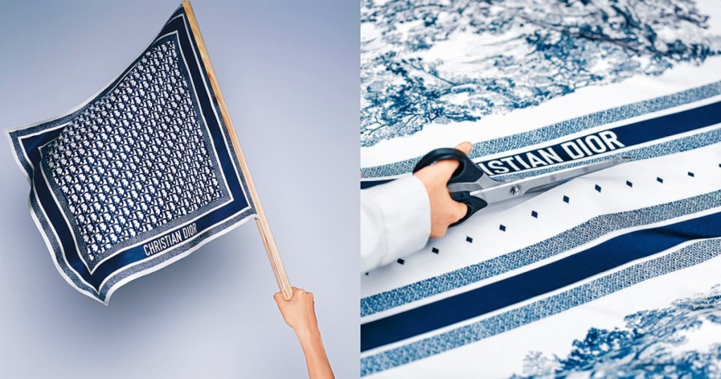 1967年由當時的品牌創意總監Marc Bohan設計的Dior Oblique斜向字樣圖案,近年由女裝系列主帥Maria Grazia Chiuri將這經典重新演繹,創作出不同新面貌。在秋冬系列的多個造型,都可見絲巾的用途廣泛,除了當作衣飾之外,又可花點心思點綴髮型、手袋及腰間,又或是綁成手繩等,塑造百變形象。