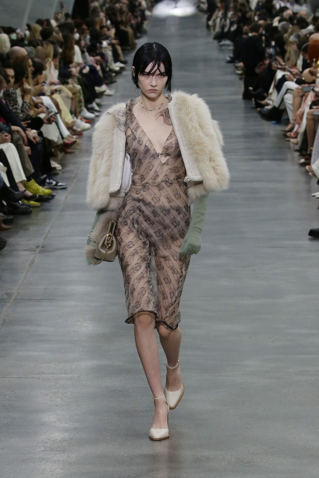 由Kim Jones主理的秋冬系列,探索剛與柔的和諧協奏。雪紡荷葉邊點綴優雅的花呢、直身裙襯以茄士咩長手套、厚裇衫呈現如束胸衣般婀娜嫵媚的綫條、男士西裝蛻變為短身外套等等,此系列正為二元對立的元素找來平衡點。新作華實兼備,着重功能與實用性,如西裝外套可解構為剪裁合度的馬甲背心,又或繫上小物袋的皮帶,可作修飾腰綫或手機袋之用。另又將捲曲的馬海羊毛加工處理,營造恍如羊絨皮的效果。之前男裝秋冬系列初曝光的O'Lock印花,亦有運用於今季女裝之中,加注飄逸神韻。皮草嵌花版本的FENDI First和特大購物袋,都是焦點新作。Baguette Bag面世二十五周年復刻版,包括茄士咩、羊絨裡皮革,以及貂皮嵌花款式,充滿冬日暖意。