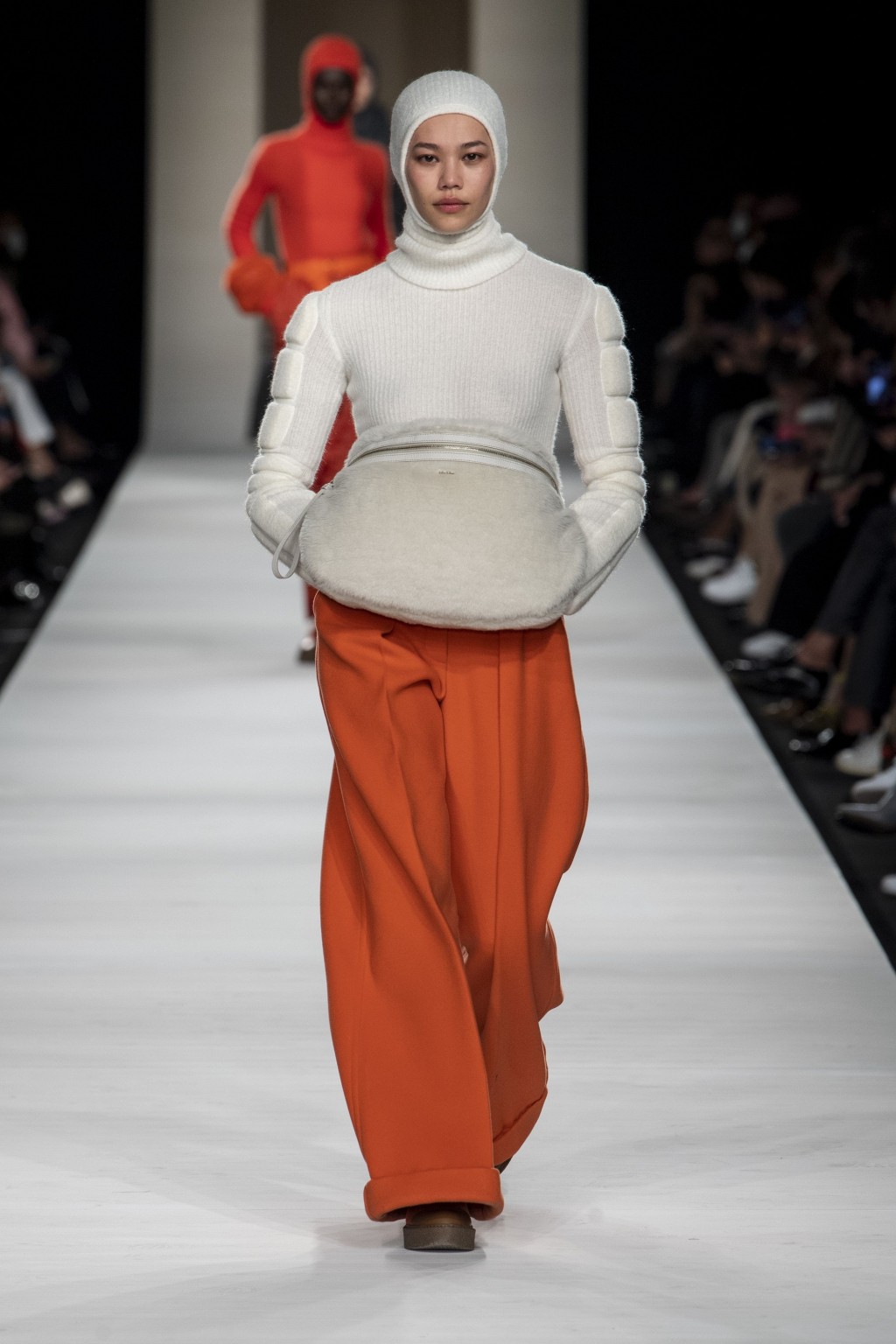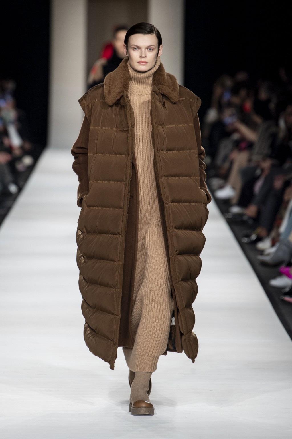 Max Mara今季從Taeuber-Arp的作品得到啟發,新裝呈現迷你與超大、緊身和誇張廓形等有趣的對比效果。緊貼小腿與腳形的絎縫針織橡膠底長靴,結合了靴子和緊身褲的設計。馬海毛毛衣,同樣配有類似的絎縫Pattern拼接衣袖。高貴優雅的鐘形裙襬半截長裙,則配搭高領緊身毛衣和針織頭套,更添時尚風範。精裁斜紋厚呢褲和高科技尼龍針織褲,均採用超寬闊腳剪裁,配搭冬日的純白色調,卻又帶來暖洋洋的窩心感覺。品牌的招牌大衣可謂每季必備,或長或短的設計,充分凸顯慵懶與不羈。跟季節相呼應的泰迪熊面料,用於大衣、束腰衫、及地長裙,甚至是短褲之中,令人驚喜。