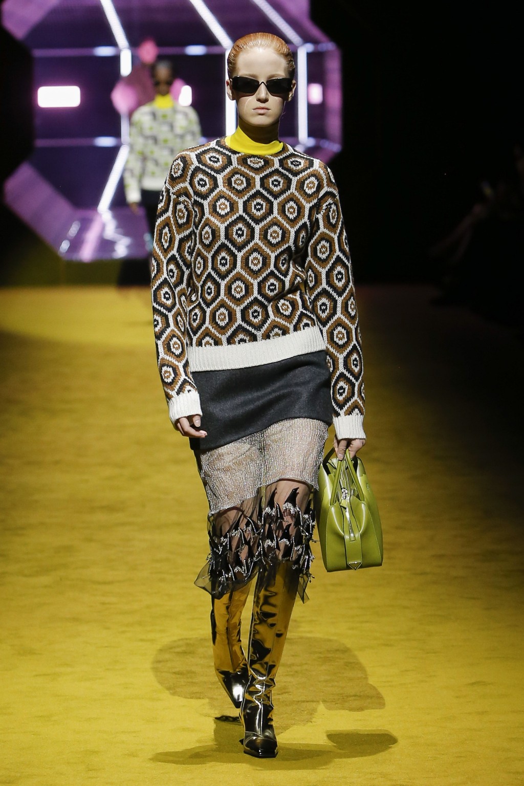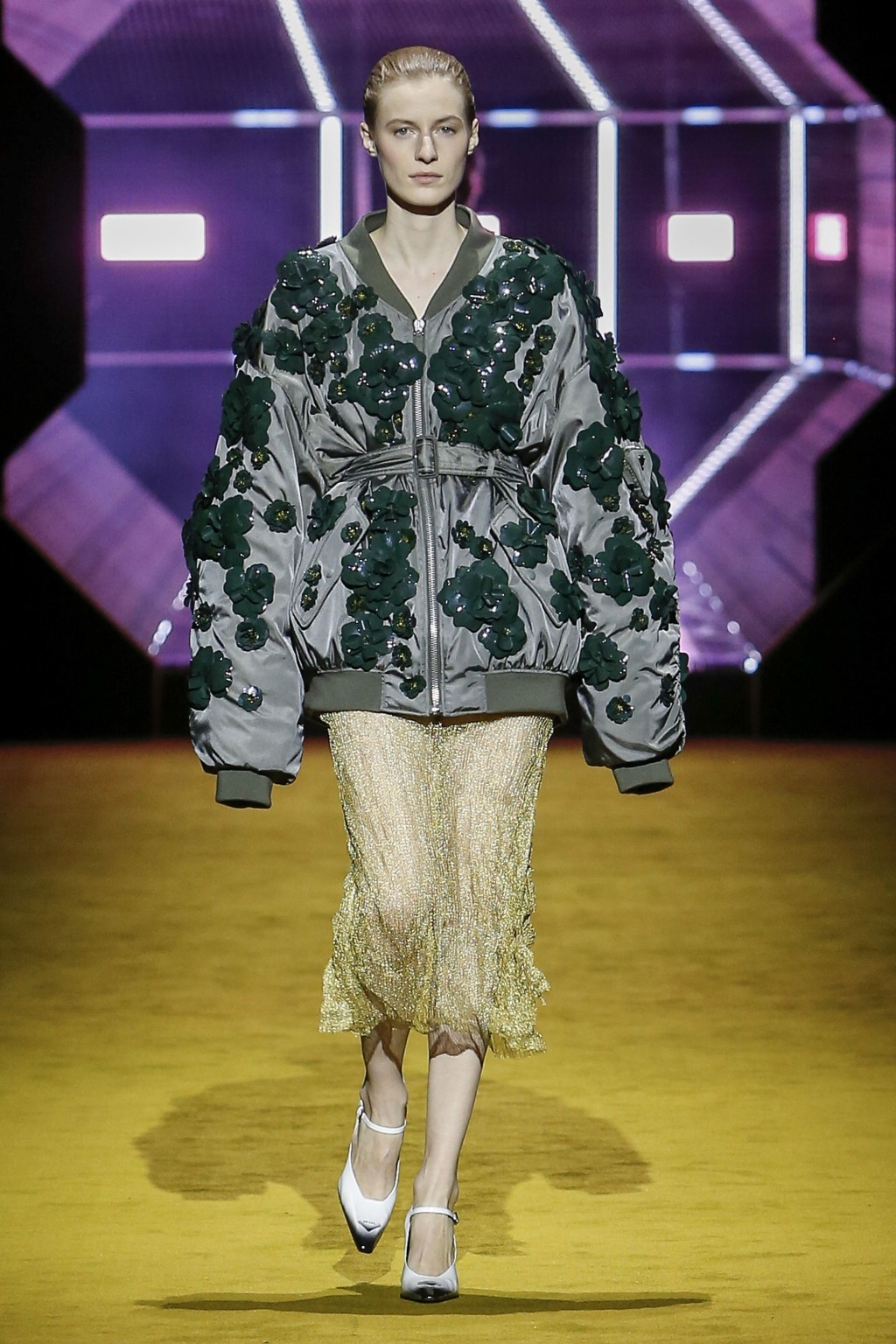 秋冬系列的主題為An Ideology of Prada,Miuccia Prada和Raf Simons今季的對話,就是訴說品牌的思想。二人構想的秋冬系列,乃為生活的日常,賦予重新定義。如男性化的輪廓,以女性化的外形呈現;運動服注入Feminine的輕柔物料,如透視網紗、寶石及刺繡等,既貫徹拿手的面料運用,也帶來出乎意料的碰撞方式。傳統的男性單品被女性的柔美意念改造,包括大衣的衣領或背部剪裁,都塑造出全新的廓形。至於今季仍可見簽名式的復古幾何圖案,則轉化為色彩豐富的提花針織設計。