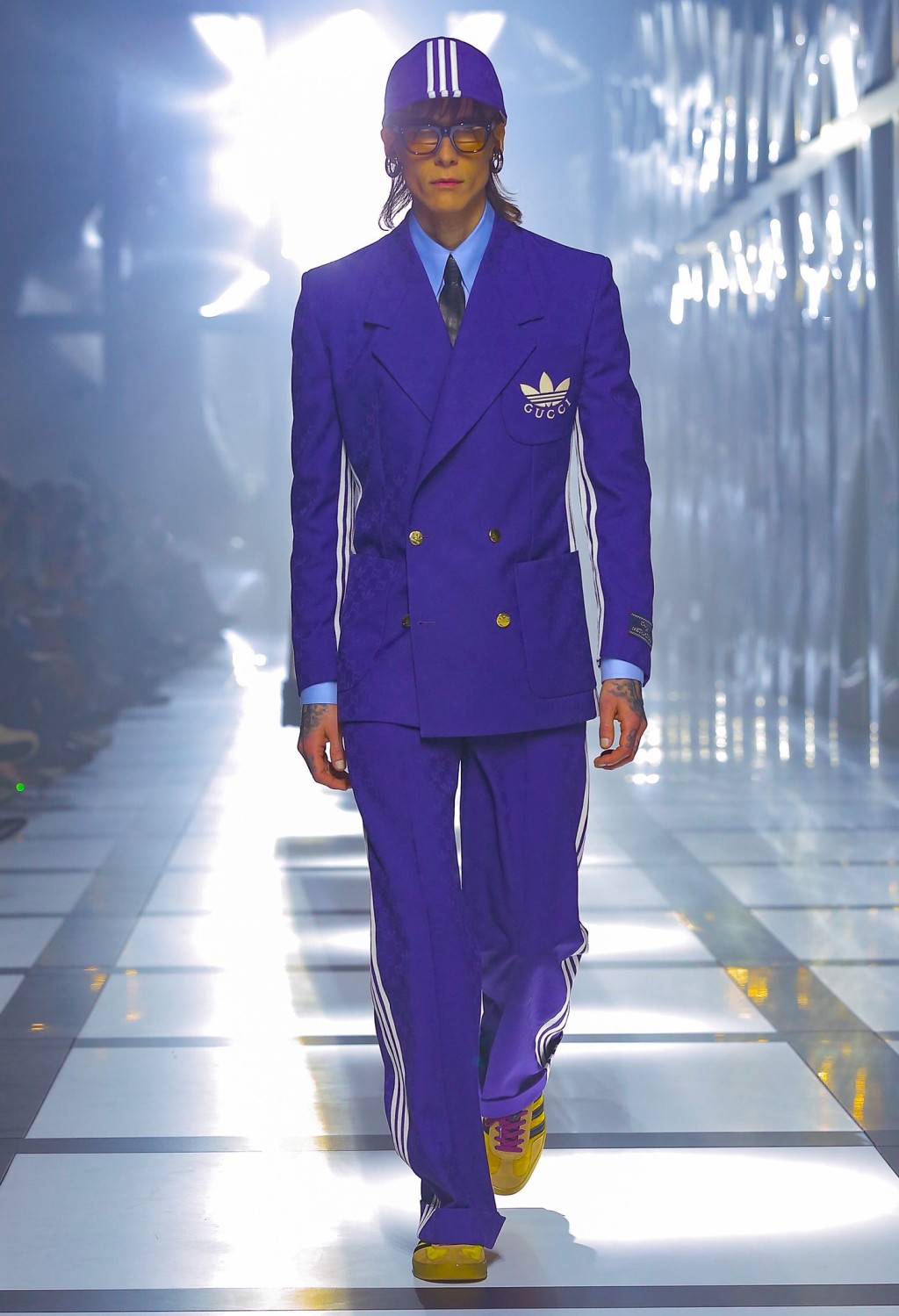 新系列最矚目的,莫過於與運動品牌adidas的聯乘合作,憑藉Alessandro擅長的混搭風格,為運動套裝延伸出既精致奢華又不失休閒感的服飾,包括緊身胸衣、西裝夾克、褲子、女裝馬甲、禮服、手套、頭套等等,完美演繹「古馳式」的高街時尚。新作設計的確多樣化,顛覆男女性別的中性形象,是其一主打,各式強調肩綫剪裁的套裝及西裝褸款,型格搶眼。配飾方面,不得不提靈感來自運動頭套或泳帽的作品,為天橋上模特兒一身造型打造亮點。