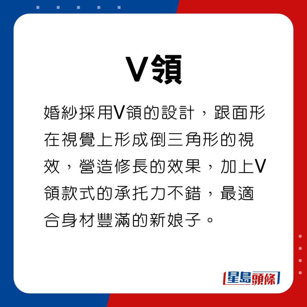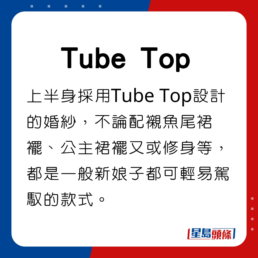 婚紗設計百花齊放,常見的款式包括長袖、一字肩、Tube Top、魚尾及V領等不同款式,確實令一眾新娘子花眼花瞭亂,難以抉擇。若非如模特兒般的高佻均勻身段,以下這些款式的婚紗乃最穩陣之選,再配合精緻浪漫的裝飾與剪裁,在大日子裡便可成為最美的女主角。