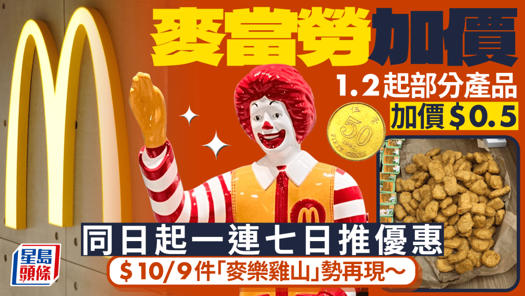 麥當勞1.2起一連七日推美食優惠 部分產品加價$0.5 麥樂雞餐及魚柳飽凍價回應經濟環境