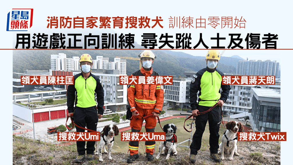與以往在英國出生的搜救犬不同,牠們在當地接受一定的培訓才回港,但自家繁殖的搜救犬,則是由零開始,領犬員姜偉文表示,除基本的體能及服從訓練,消防處十分着重透過遊戲正向訓練,培訓搜救犬尋找失蹤人士及傷者。