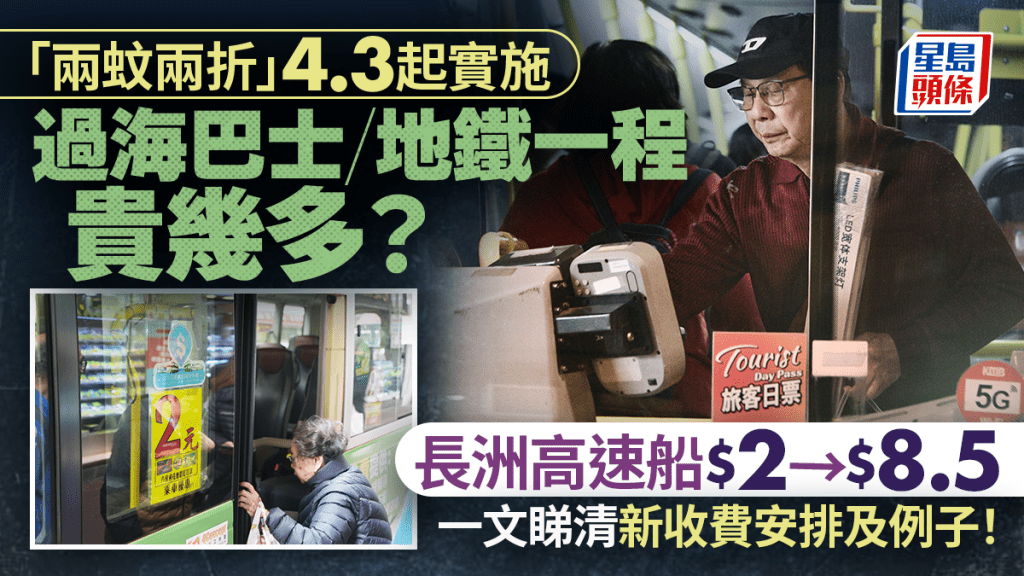 至於渡輪,以往普通和高速船在任何日子都劃一收費2元,但4月3日起,以中環往長洲(星期日及公眾假期)為例,普通渡輪成人票價22元,兩折後為4.4元,比之前多付2.4元;而高速船加幅更高,成人票價42.3元,兩折後為8.46元,比之前多付6.46元。