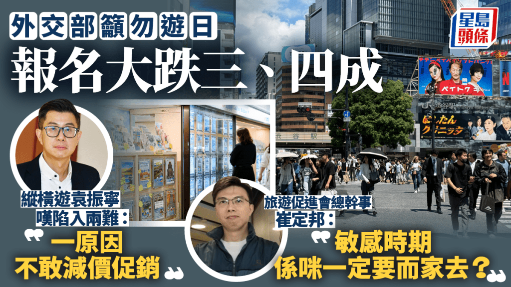日本首相高市早苗早前在國會拋出「台灣有事」論,觸發北京強烈反彈,宣布暫停入口日本水產品,呼籲國民盡量不要赴日,導致內地出現大規模退房、退機票情況。縱橫遊常務董事袁振寧向《星島頭條》表示,抵制情緒近日升溫發酵,過去一兩日明顯影響港人報團赴日意欲,赴日團查詢及報名數字跌幅達三、四成,但未有客人選擇取消已報的日本團。