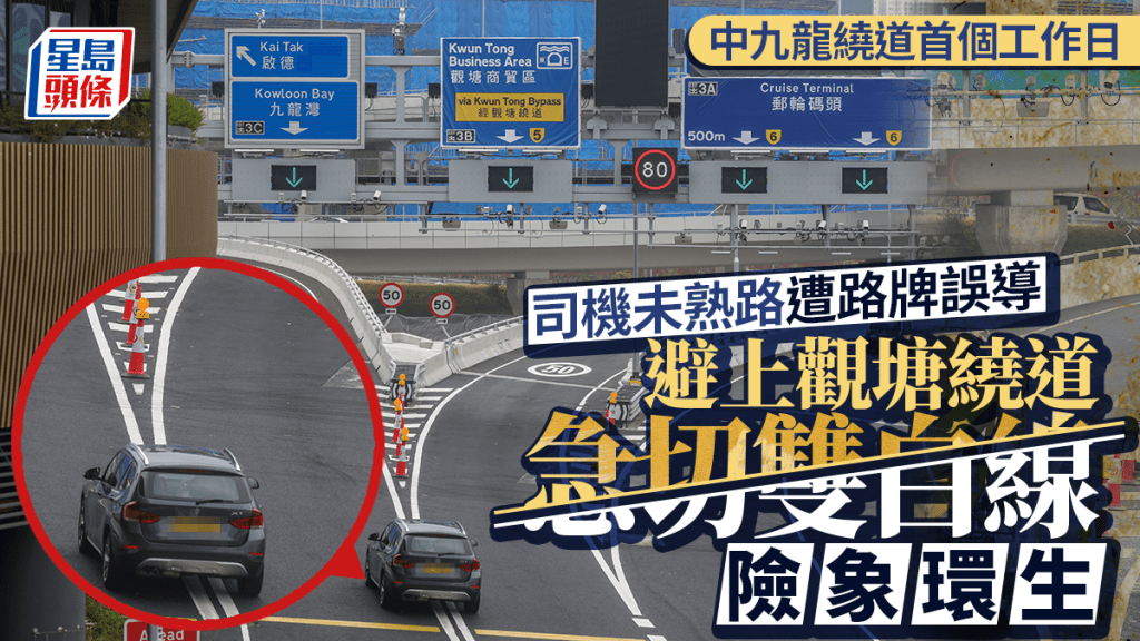中九龍繞道︱首個工作日司機未熟路 往啟德疑遭路牌誤導 避上觀塘繞道急切雙白線