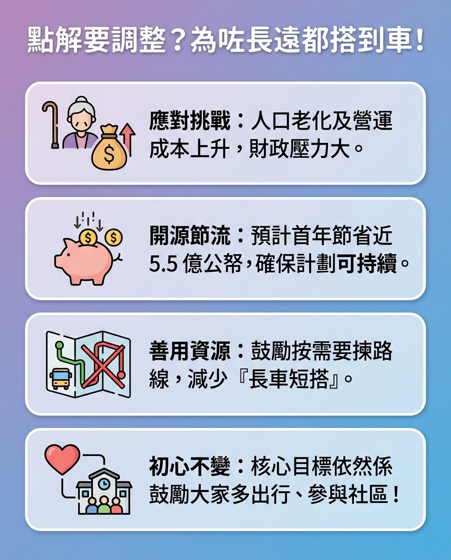 至於每月240程的車程上限安排,暫時不會實施,明年才會實施,政策會分兩步走,技術問題解決後再向大家解說。他估計,接下來財政年度可節省5.5億元。