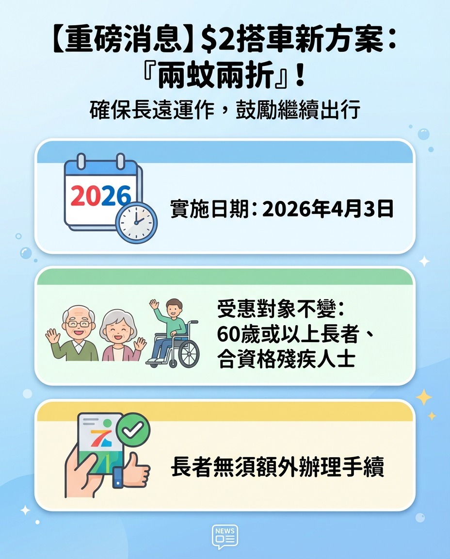 【2元乘車優惠/兩蚊兩折】政府今日(3月23日)公布,2026年4月3日起,2元乘車優惠計劃,將由2元劃一收費調整為「兩蚊兩折」,即成人票價低於或等於10元,受惠人士可維持繳付2元車費,高於10元則繳付成人票價的兩折,轉乘車程同樣適用。勞工及福利局局長孫玉菡今日中午12時,於政府總部會見傳媒,解釋有關計劃新安排。