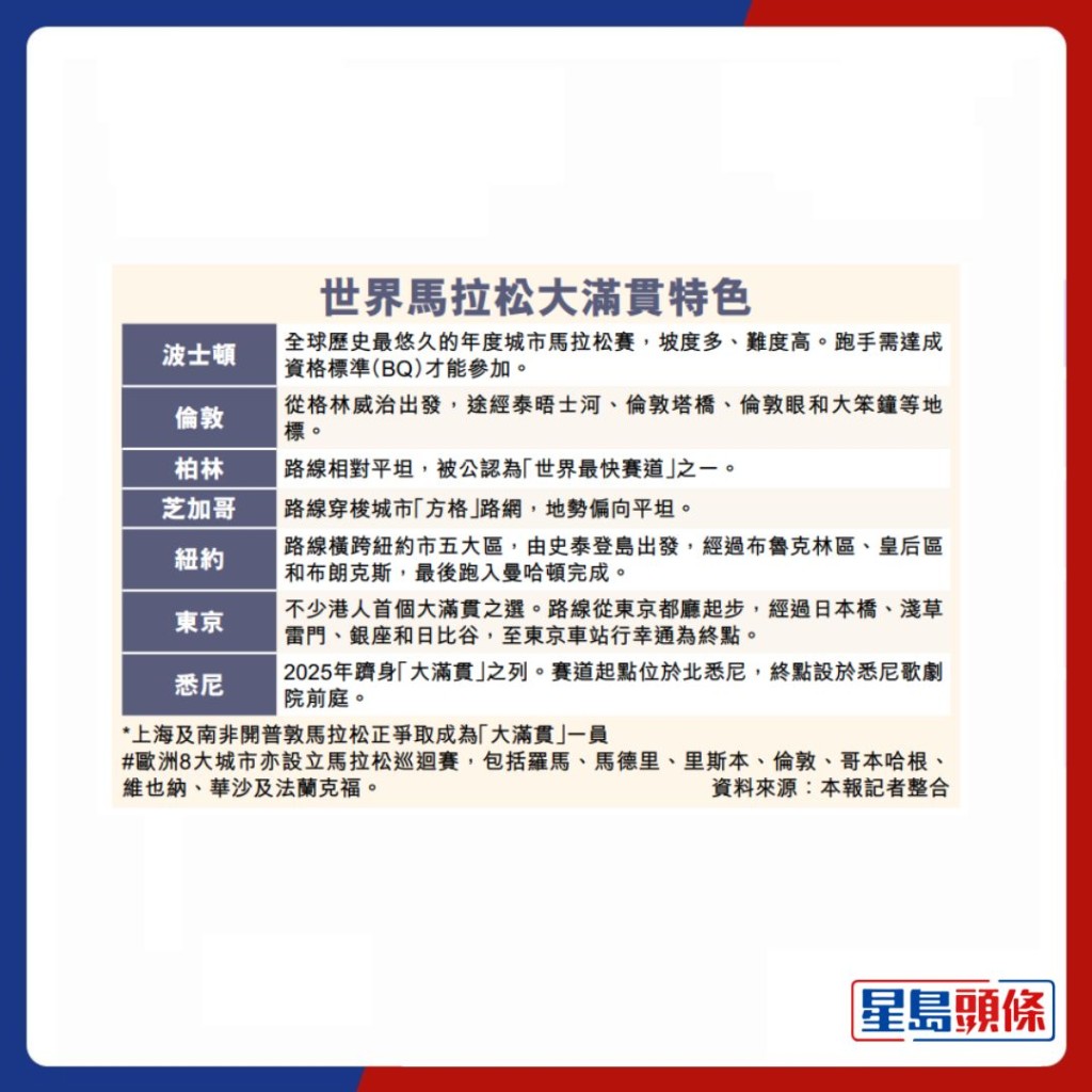 國際品牌估值研究機構Brand Finance發表《Marathons 50 2025》報告,列出全球50項馬拉松賽事品牌,首3位依次為倫敦、紐約及巴黎馬拉松,香港則位列第44位。報告亦評估賽事對主辦城市的經濟影響力,芝加哥馬拉松位列榜首,影響力為6億2700萬美元(逾49億港元),「7大馬」合共約26億8300萬美元(逾210億港元),香港馬拉松則約為2900萬美元(逾2.2億港元)。