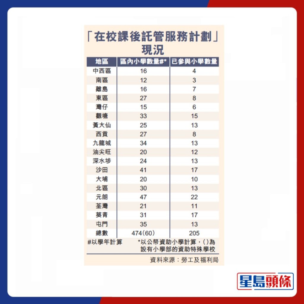 「在校課後託管服務計劃」推行短短數年,參與學校及服務名額錄倍數增長,政府打算擴展計劃。社福界指,該計劃成功協助弱勢社群及單親家庭成員外出工作、幫補家計,有效紓緩家庭壓力及提升親子關係。目前,基層社區的小學參與度較高,教育界指,仍有個別學校因行政成本而卻步。有資深社工指,不少收入不高的雙職家庭亦希望申請,建議放寬申請資格並增設付費模式,當局亦宜收集參與家庭的收入變化的數據,以檢視計劃成效。