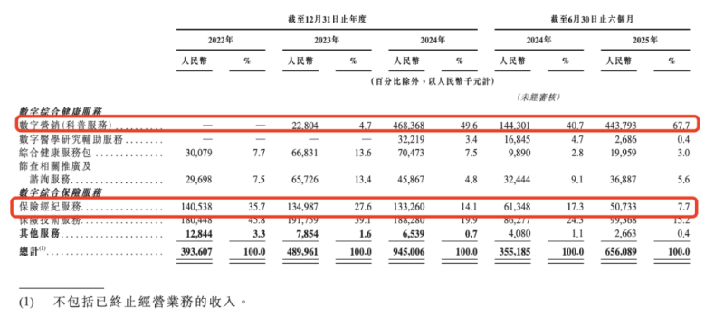 業績波動主要源自於營收結構的根本性改變。 《星島》記者從招股書了解到,線上眾籌業務剝離前,輕鬆健康集團的營收主要來自數位綜合保險服務,即為保險公司銷售保險產品的保險經紀服務,而剝離後,公司主營業務變為數位行銷(科普服務)。2024年,前者毛利率約為64.8%,但後者的毛利率卻只有7.6%,有逾8倍的懸殊差距。