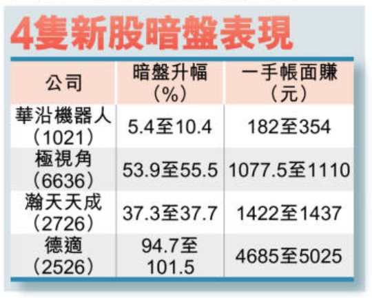 4新股暗盤「報捷」德適帳面倍賺 華沿機器人僅揚一成