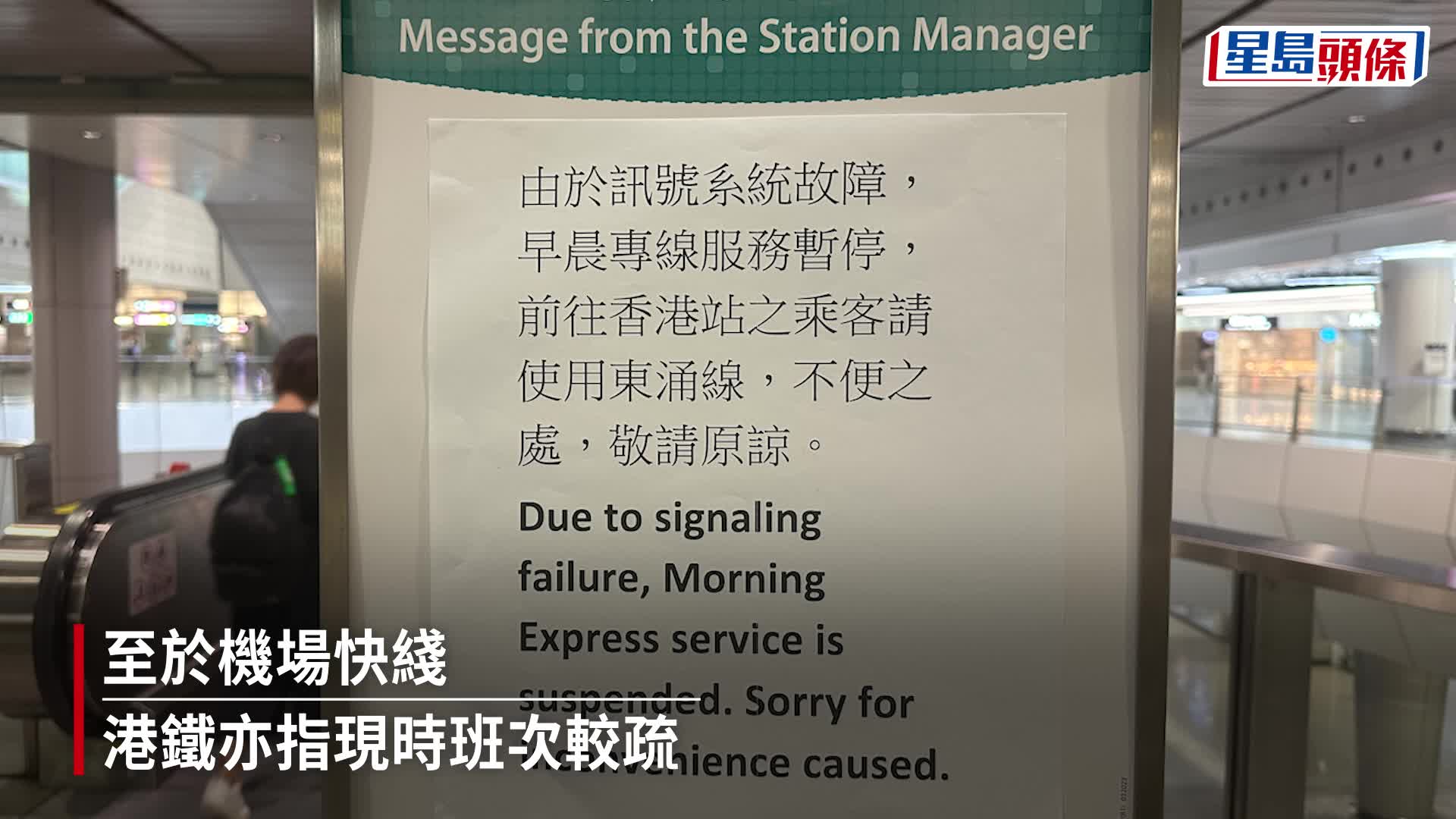 重播 立即播放 港鐵九龍站早上信號故障 機場快綫及東涌綫一度12分鐘一班車 港鐵於今日(5日)早上7時59分宣布,由於九龍站附近有信號故障,機場快綫及東涌綫列車服務需要作出調整,機場快綫來往香港至博覽館站維持15分鐘一班車;東涌綫來往香港至青衣站維持6分鐘一班車;而東涌綫來往香港至東涌站維持12分鐘一班車,呼籲乘客為行程預留充裕時間。 至於機場快綫因為現時班次較疏,港鐵亦指香港站市區預辦登機服務的截至時間,由飛機起飛前90分鐘調整至120分鐘。港鐵人員現正進行搶修。 【1 港聞 2023-09-05 12:23 HKT 閱讀更多