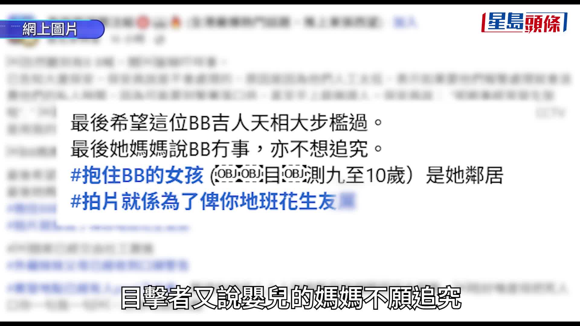 重播 立即播放 紅磡虐嬰案|11月大女嬰遭印度籍女童推跌地上 警拘女童母親涉疏忽看管 周二(9月30日)網上流傳一段可怖虐待嬰兒片段,片中所見一名南亞裔女童,在某大廈外走廊長凳上抱着嬰兒時,突然將嬰兒放在長凳並推落地下。嬰兒面部著地硬撼,頓時哭聲震天。片段曝光後引來網民熱議,頻呼看完片段後驚心動魄,深怕嬰兒受傷。警方今日(10月1日)證實案件發生於周二當日,現場為紅磡一過渡性房屋內,已就事件拘捕女童母親。 警方今日表示,昨日接獲一名職員報案,指在紅磡紅樂道9號對開發現一名11個月大 港聞 10小時前 閱讀更多