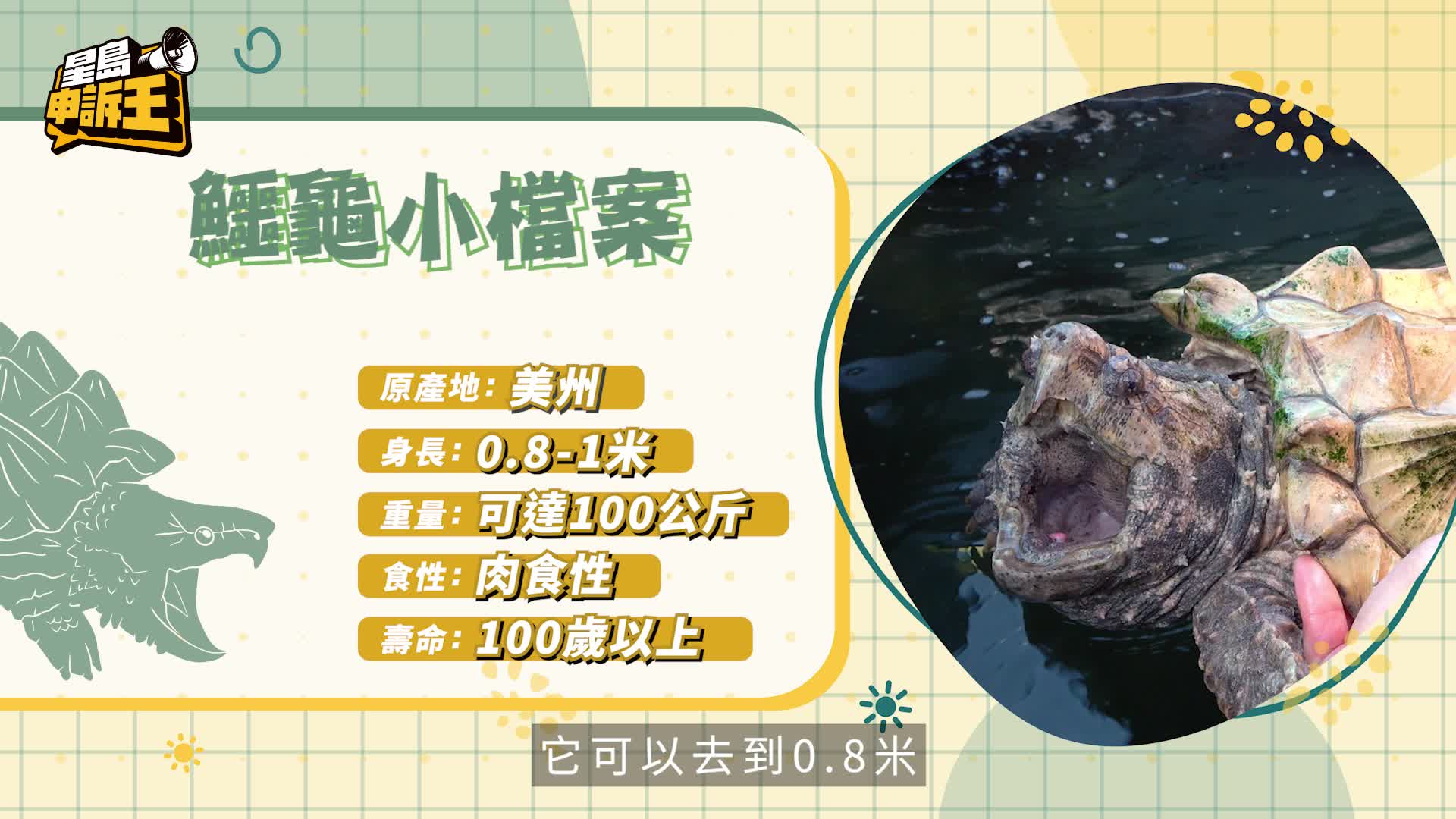 重播 立即播放 星島申訴王 | 1米長鱷龜被棄元朗魚塘變「食魚巨獸」 專家勸勿當寵物養:幾乎無天敵! 香港最近出現數宗體型龐大、外貌兇猛的鱷龜被棄養郊野個案。最近一宗發生在今年1月中旬,有市民在元朗大生圍魚塘,發現一隻長1米、重85公斤的大型鱷龜出沒。該隻鱷龜傷痕累累,被救起後需要送醫救治;另一宗則發生在去年底,一隻近半米鱷龜在荃灣曹公潭被救起。救起兩隻鱷龜的「龜途」負責人陳仲邦(阿邦)接受《星島申訴王》訪問時表示,幾乎每個月都有鱷龜拯救事件,呼籲市民不要因一時興起飼養繼而隨意棄養,不但對本地生態 港聞 2小時前 閱讀更多
