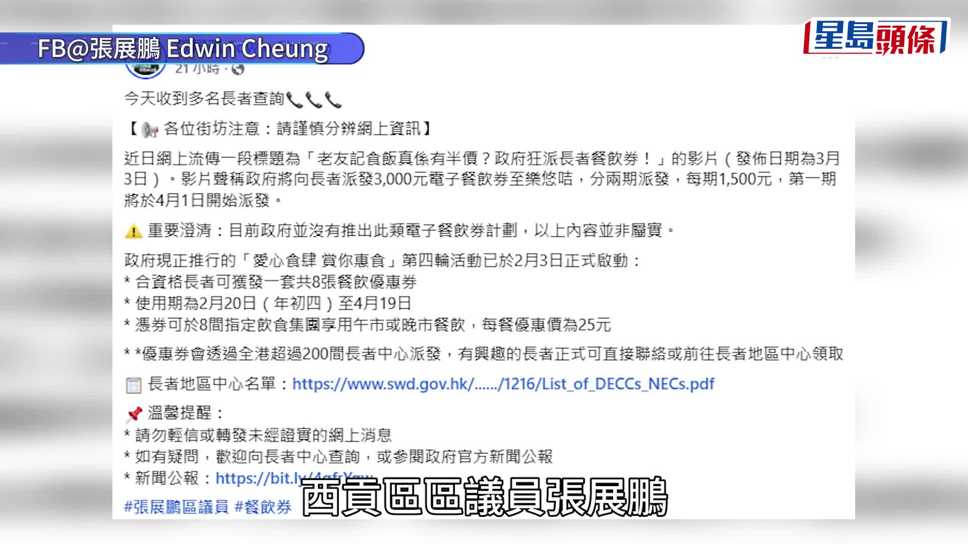 重播 立即播放 網傳政府向長者派電子餐券 勞福局澄清絕無其事 區議員接長者查詢:套路完整 近日即時通訊群組及社交平台瘋傳一條題為「老友記食飯真係有半價?政府狂派長者餐飲券!」的YouTube影片,影片以AI生成,聲稱將分兩期向長者派發3,000元電子餐飲券至樂悠咭,長者以樂悠卡在合資格食肆食飯,便可獲扣減半數。勞福局昨日(5日)發稿,澄清絕無其事,並已向相關社交媒體平台舉報,並保留一切法律追究的權利。 西貢區區議員張展鵬今早(6日)接受電台訪問表示,其辦事處接獲多名長者求助,希望協助核 港聞 17小時前 閱讀更多