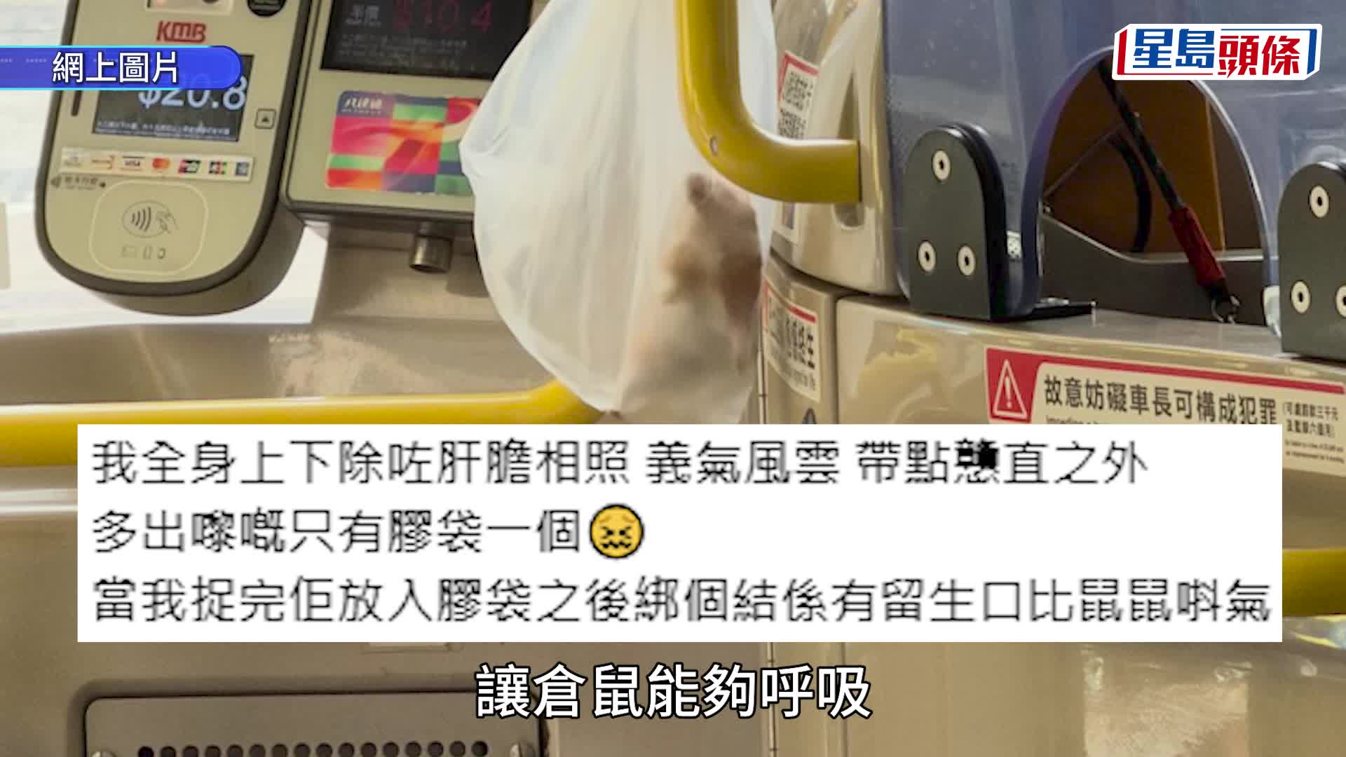 重播 立即播放 九巴車廂驚現肥倉鼠 熱心人捉起放膠袋交車長:有留窿畀鼠鼠唞氣 九巴車廂驚現一隻懷疑走失的倉鼠,幸有一班有心人救起!今日(22日)有網民在社交平台Threads發文,指早上10時左右乘搭九巴182路線時,驚見一隻奶油色的肥倉鼠在車廂內,瑟縮一角,狀甚驚慌。該名網民沒有袖手旁觀,更立即捉起倉鼠放入膠袋,再交予車長處理,「麻煩大家請廣傳,主人快啲接返佢屋企啦」。 根據事主上載的片段所見,倉鼠被放在透明膠袋內,之後掛在車長旁邊的扶手。事主強調膠袋綁口時留有空隙,讓倉 港聞 5小時前 閱讀更多