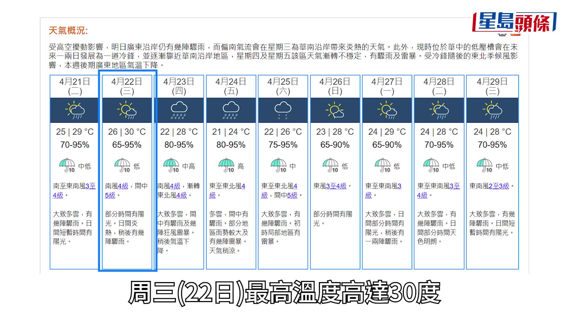 重播 立即播放 天氣︱天文台料明起連落6日雨 低壓槽、東北季候風「接力」攻港 周五、六迎降溫 天文台今日(4月19日)指,正午時分本港大部分地區氣溫上升至29度左右。預料本港地區下午及今晚大致天晴,能見度較低。下午炎熱及乾燥,吹微風。 天文台料本周後期氣溫稍為下降 天文台展望明日有幾陣驟雨,隨後一兩日日間炎熱。星期四及星期五間中有驟雨,氣溫稍為下降。預料一道低壓槽會在本周中後期影響華南地區,該區間中有驟雨及雷暴。受低壓槽隨後的東北季候風影響,本周後期該區氣溫稍為下降。 根據天文台九天天氣預 港聞 2026-04-19 13:19 HKT 閱讀更多