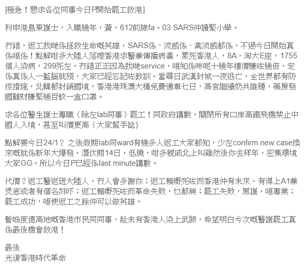 【武汉肺炎】网民号召医护罢工 图迫港府锁边境抗疫