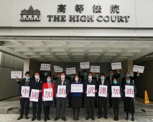 一行17人自称香港律师的人士,于今日(7日)在香港高等法院正门参加「支持祖国抗疫快闪行动」,高举「中国加油」、「武汉加油」、「香港加油」牌,又高呼「中国加油!武汉加油!香港加油!香港律师支持你!」