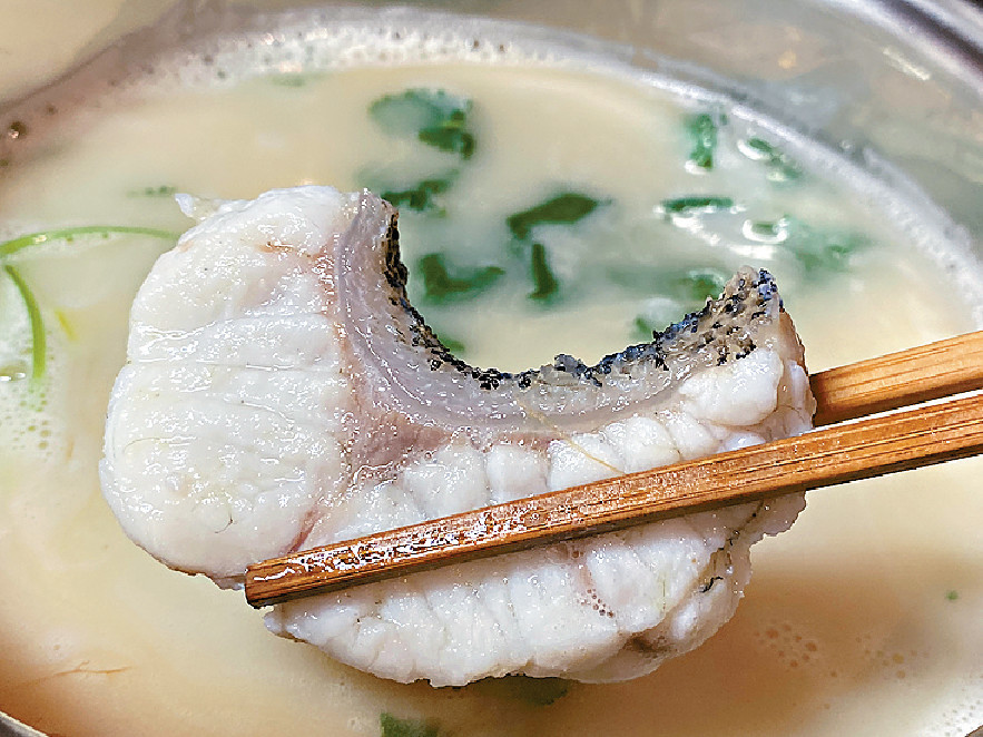 从前都是用小型樽装气体的炉头,放一个不锈钢锅上去,现在便宜的多功能小型电锅更方便,已是打边炉不二之选。第一次用鱼汤包做打边炉汤底,先将两包龙趸鱼汤落锅,加两把芫荽引味,鱼汤瞬间已滚起,灼一片花尾龙趸鱼片,鲜甜到不得了(见图)。不过,鱼汤实在太浓,打算落一倍水,方便灼食物,却被家人当场喝住。