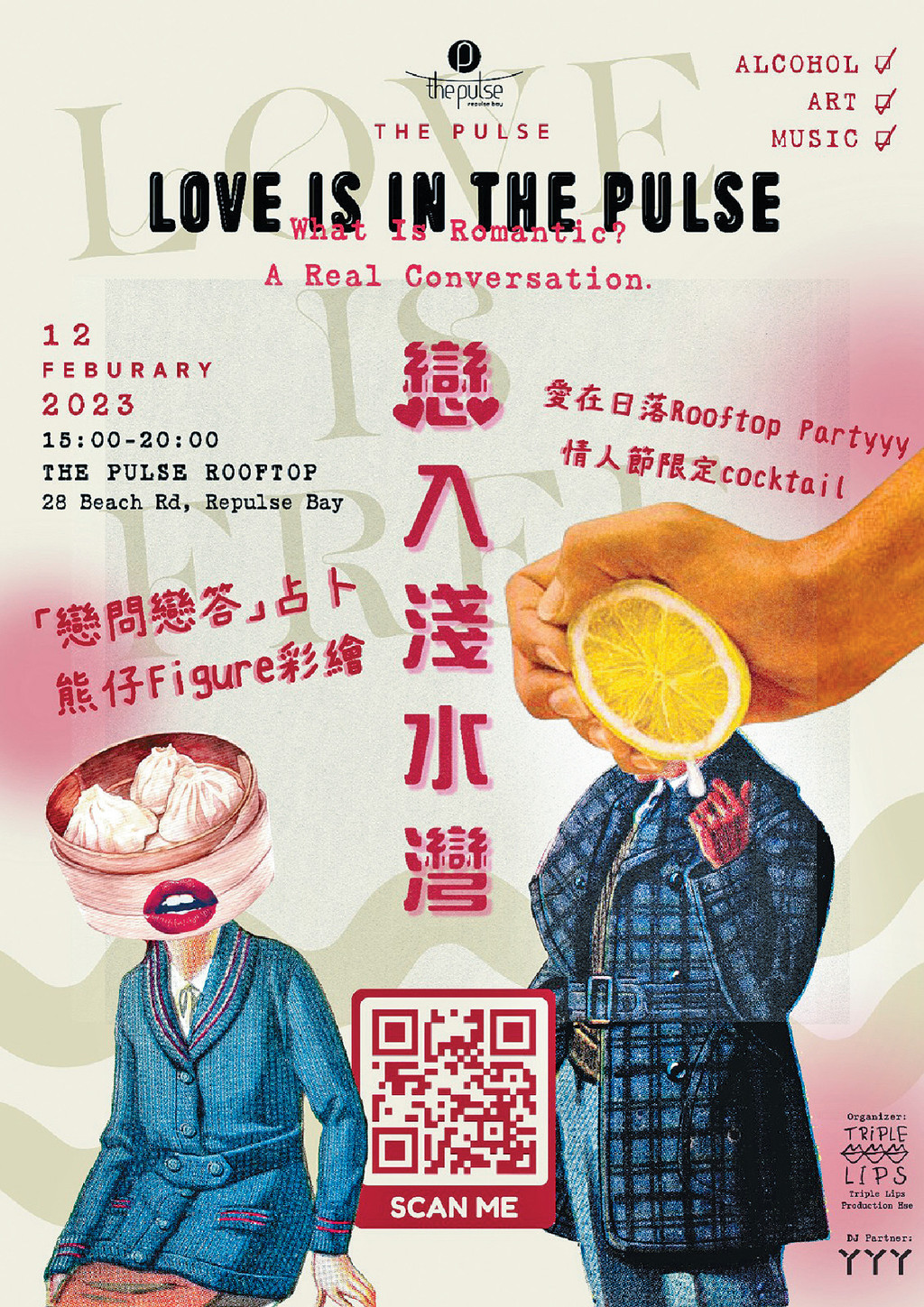 2月12日三唇制造联同丫丫丫喺浅水湾the pulse商场举行一场盛大嘅天台派对「爱在日落Rooftop Partyyy」,由本地DJ为浪漫落日配上动人乐章。现场仲有「恋问恋答」占卜环节,参加者可以透过卜卦、生命灵数及塔罗牌等问问前程,趋吉避凶。喺Cocktail Bar度仲可以坐喺180度无死角海景天台,叹住情人节限定Cocktail,同情人听住音乐享受浪漫嘅日落时分!