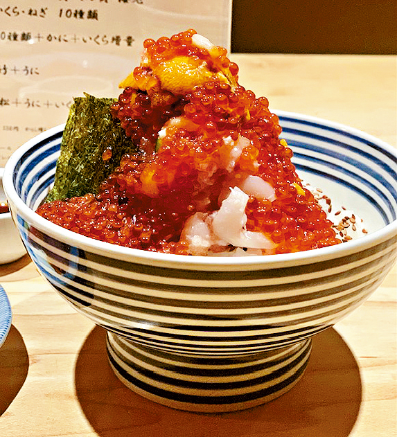 「日本桥海鲜盖饭辻半」12年前在日本桥开业,迅即走红,成为海鲜盖饭名店。所谓「盖饭」,即杂锦刺身铺在白饭之上,而「辻半」与众不同,每天到鱼市场采购新鲜海鱼、贝壳类等刺身,切成肉蓉混合,如一个袖珍山丘,放在日本米饭之上,用手机打卡,五颜六色,不知者,还以为是一碗鲜果汁「沙冰」,外型讨好,未吃先让人喜欢。