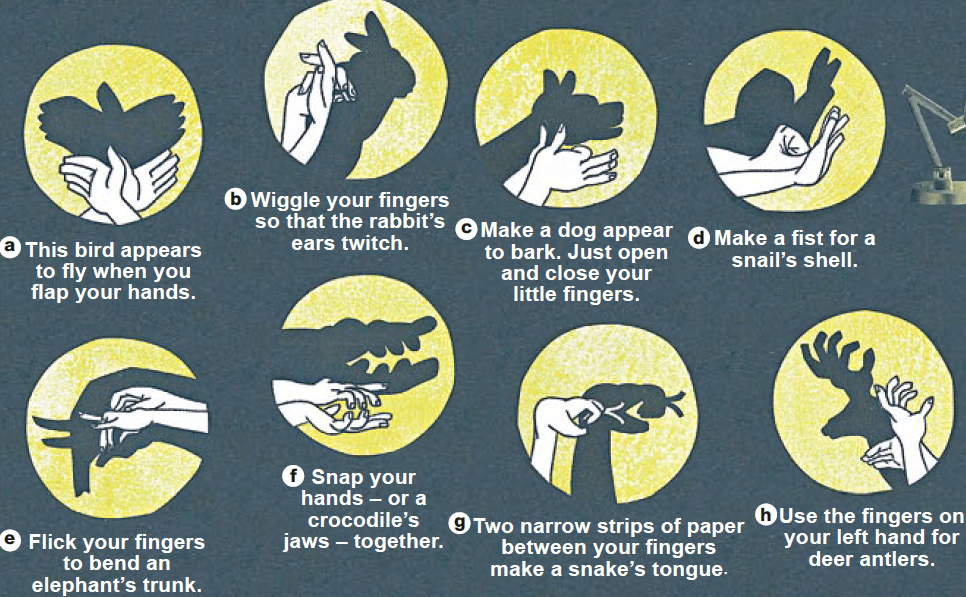 Impress your audience by making all these different animal shadow shapes with your hand.