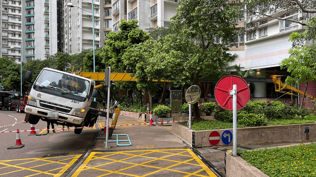 事后保安用雪糕筒及封条将现场围封,避免居民靠近。据了解,吊臂车当时有伸出4支油压支撑架固定车身,工人则登上工作平台准备为一个低层单位进行通渠工程,惟左边的2支油压支撑架底盘有轻微「甩骹」,导致车身失去重心倾斜,四轮凌空离地,吊臂则压向建筑物,而路边的栏杆亦被压毁。